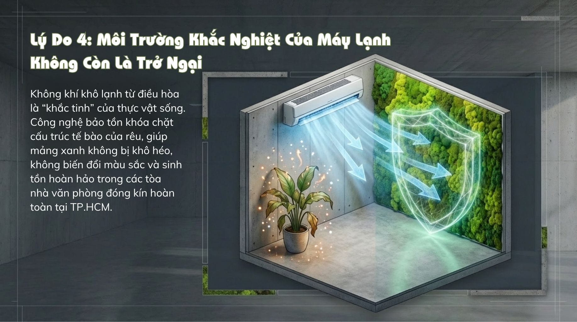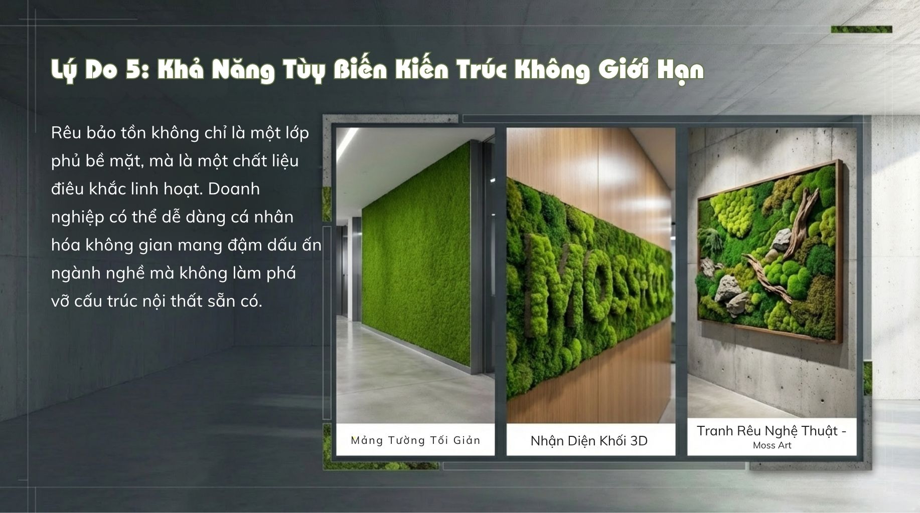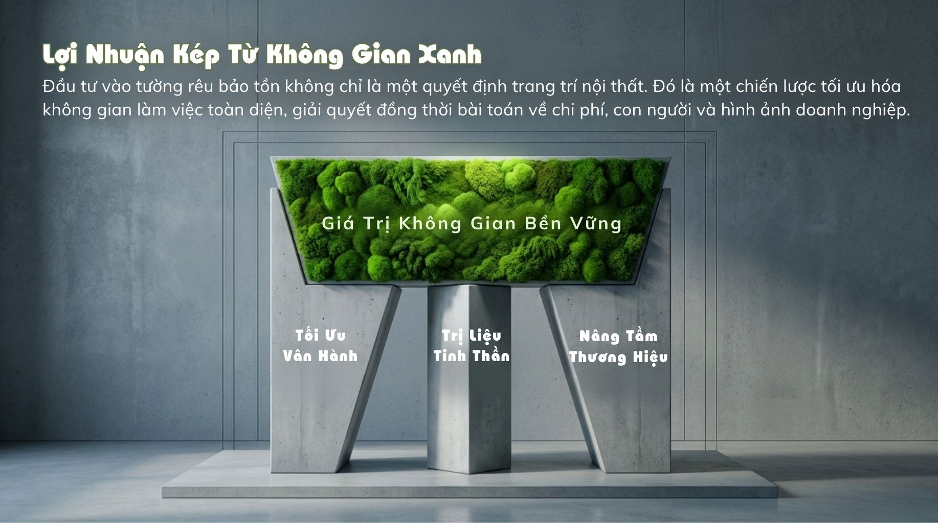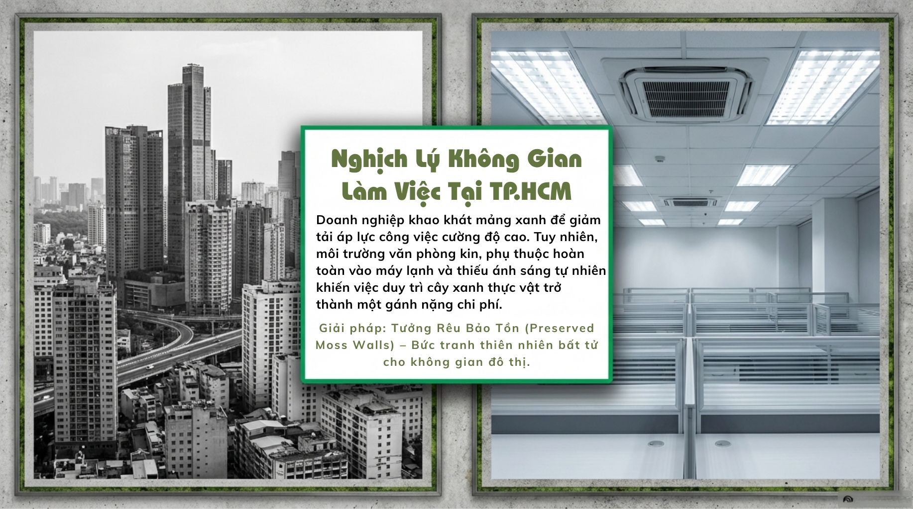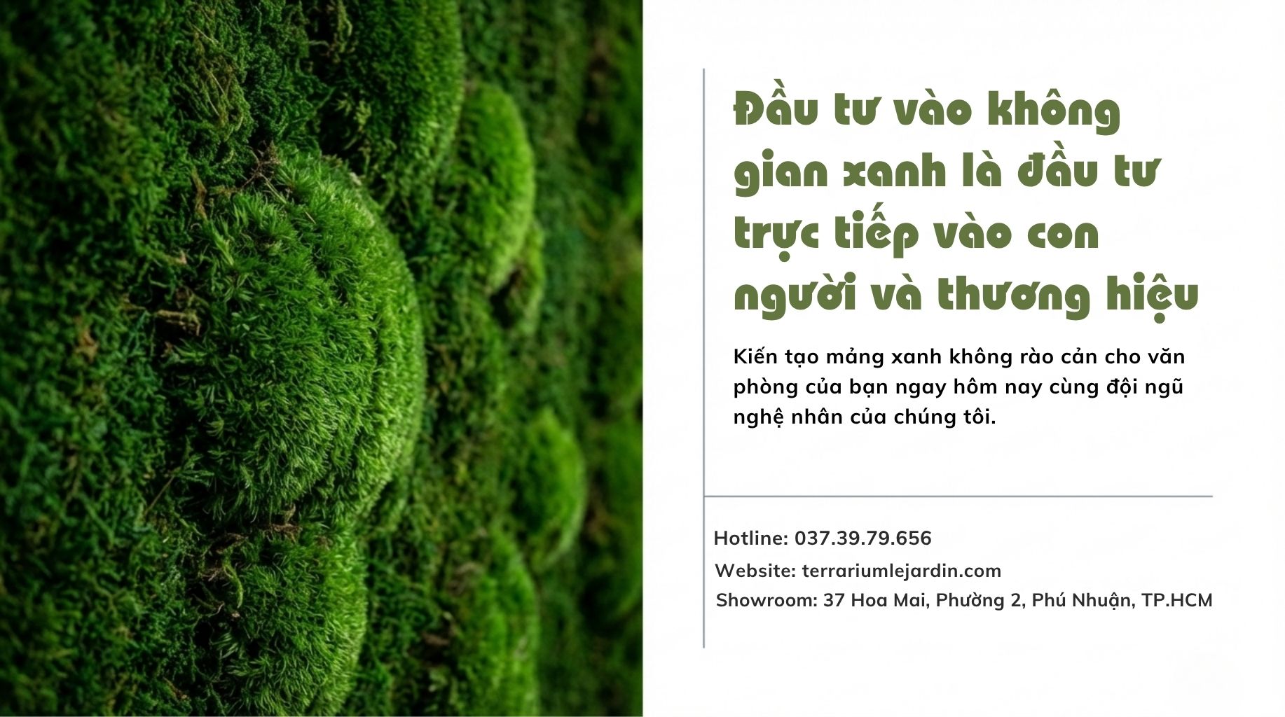 Trong bối cảnh không gian làm việc ngày càng được chú trọng về trải nghiệm và cảm xúc, tường rêu văn phòng đang trở thành lựa chọn hàng đầu của nhiều doanh nghiệp tại TP.HCM. Không chỉ mang lại vẻ đẹp tự nhiên, tường rêu bảo tồn còn giúp tối ưu chi phí vận hành và nâng cao hiệu suất làm việc của nhân sự.