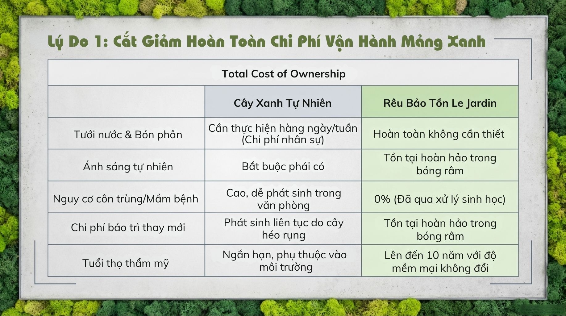 Có thể thấy, tường rêu văn phòng không chỉ là giải pháp trang trí mà còn mang lại nhiều giá trị thiết thực về thẩm mỹ, tinh thần và chi phí vận hành. Đặc biệt tại TP.HCM – nơi nhịp sống nhanh và áp lực công việc cao, việc đầu tư vào một không gian xanh như tường rêu bảo tồn là lựa chọn thông minh và bền vững.