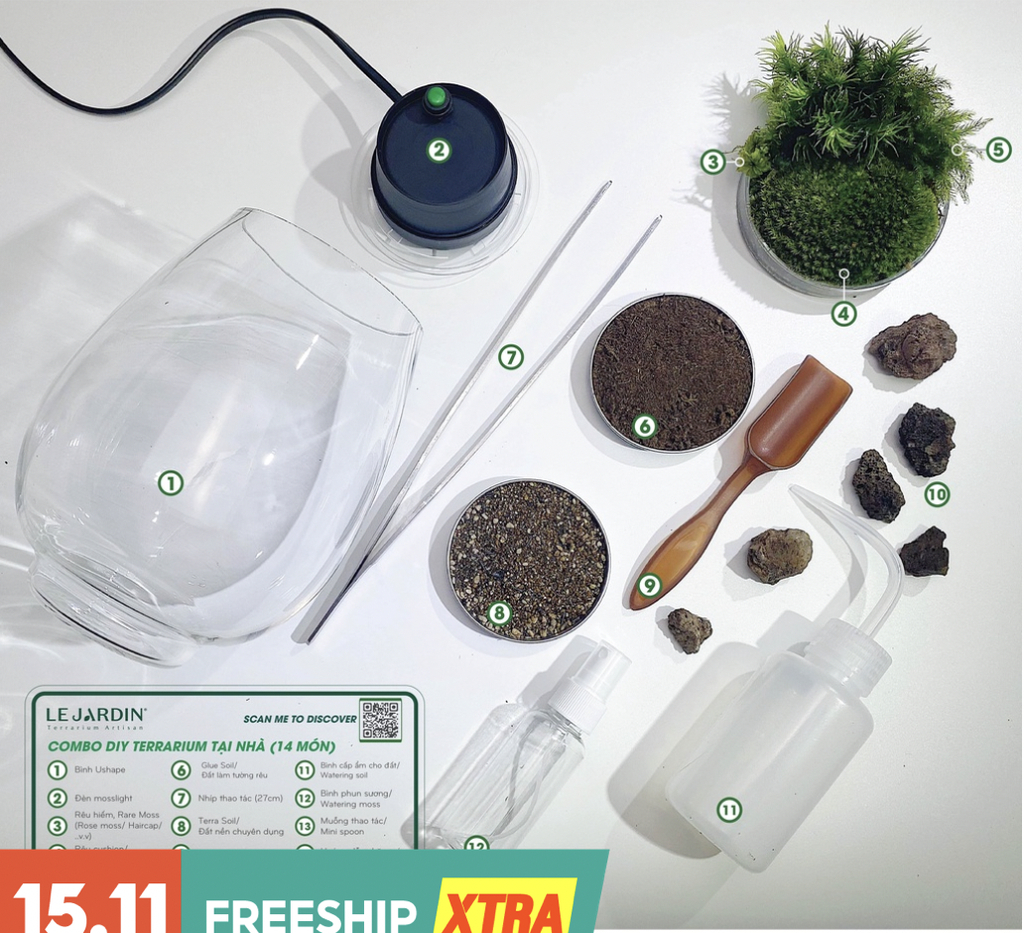 Với sự đa dạng của rêu mix, bonsai mini và các dụng cụ hỗ trợ, bộ 16 món cho phép bạn tạo nhiều phong cách bố cục như rừng mini, tường rêu, suối đá… mang đến một terrarium sống động và bền đẹp theo thời gian.
