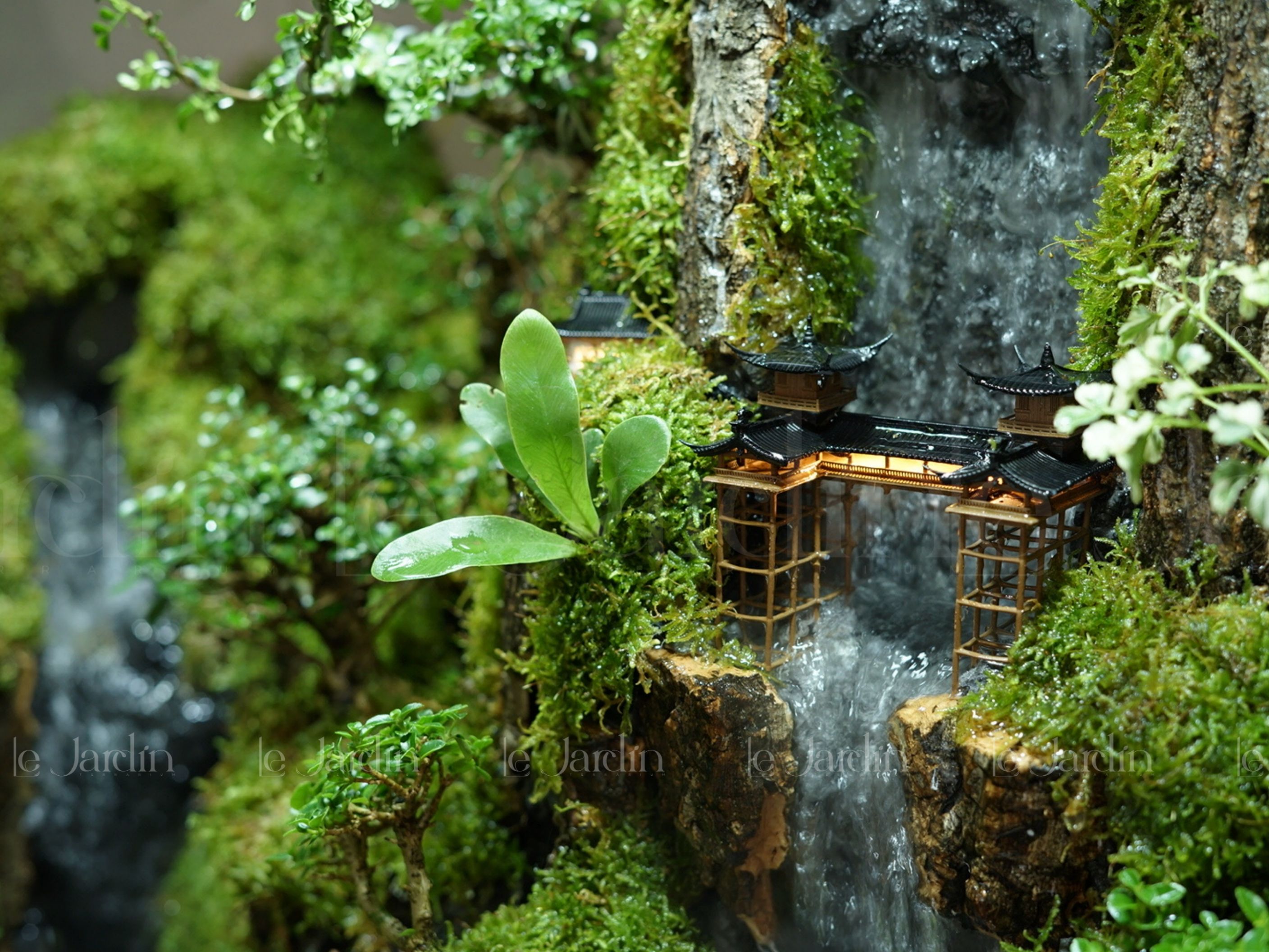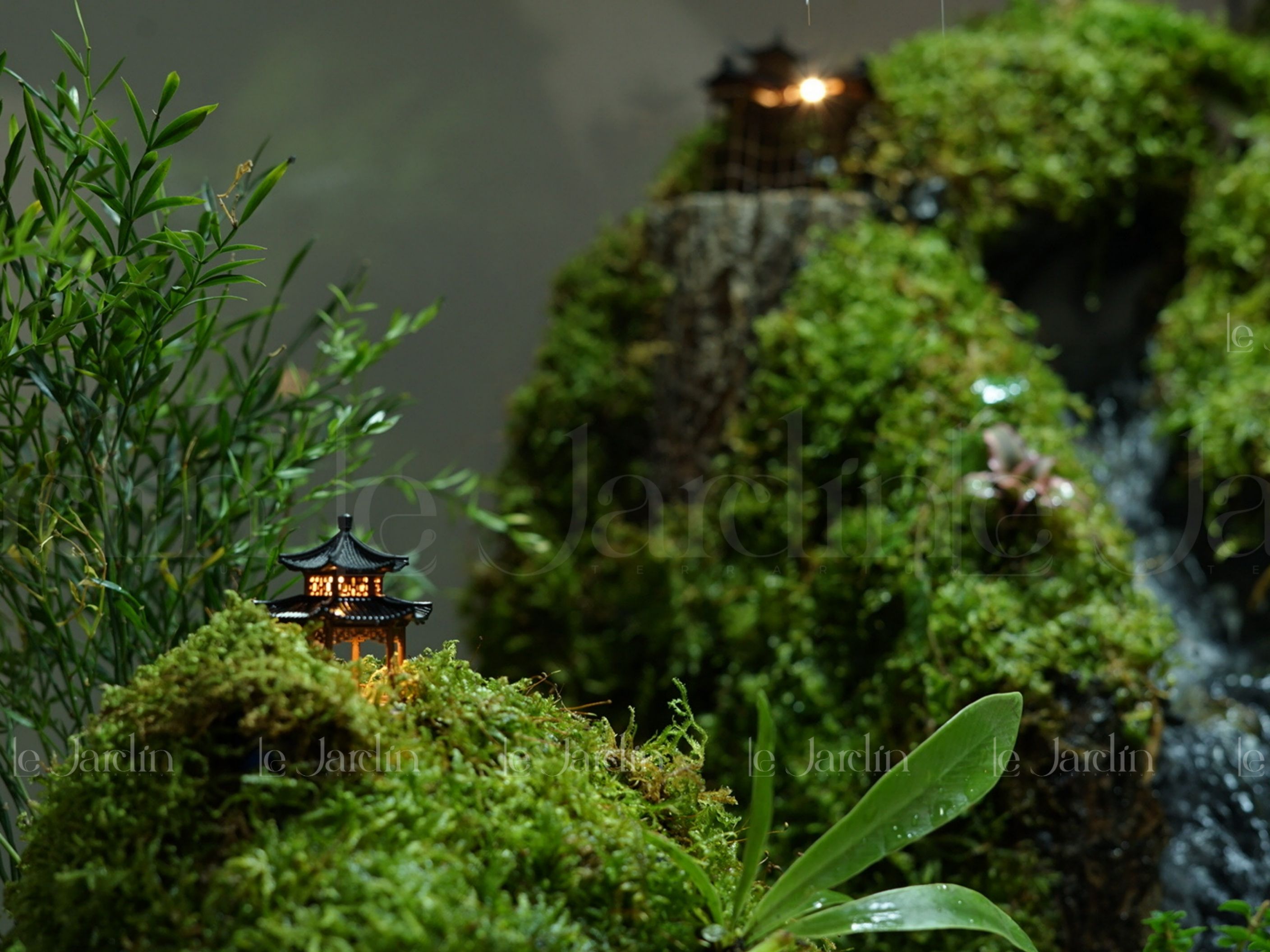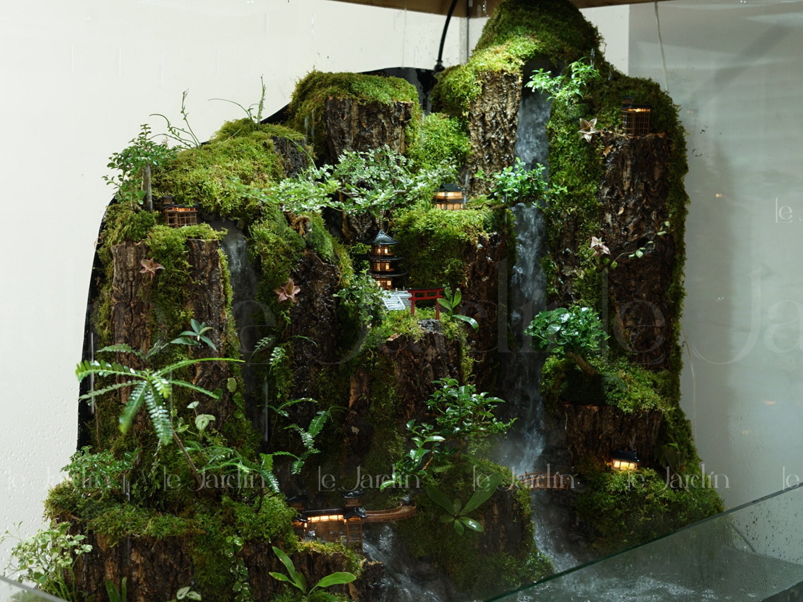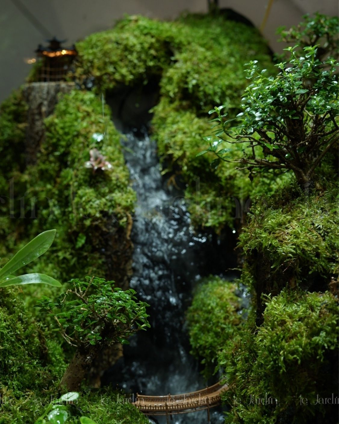 Sự kết hợp hài hòa giữa rêu phong organic, đường vân gỗ tự nhiên và chi tiết tượng nghệ thuật tạo nên một bố cục thư thái, gợi cảm giác như đang đứng giữa một góc rừng thu nhỏ.