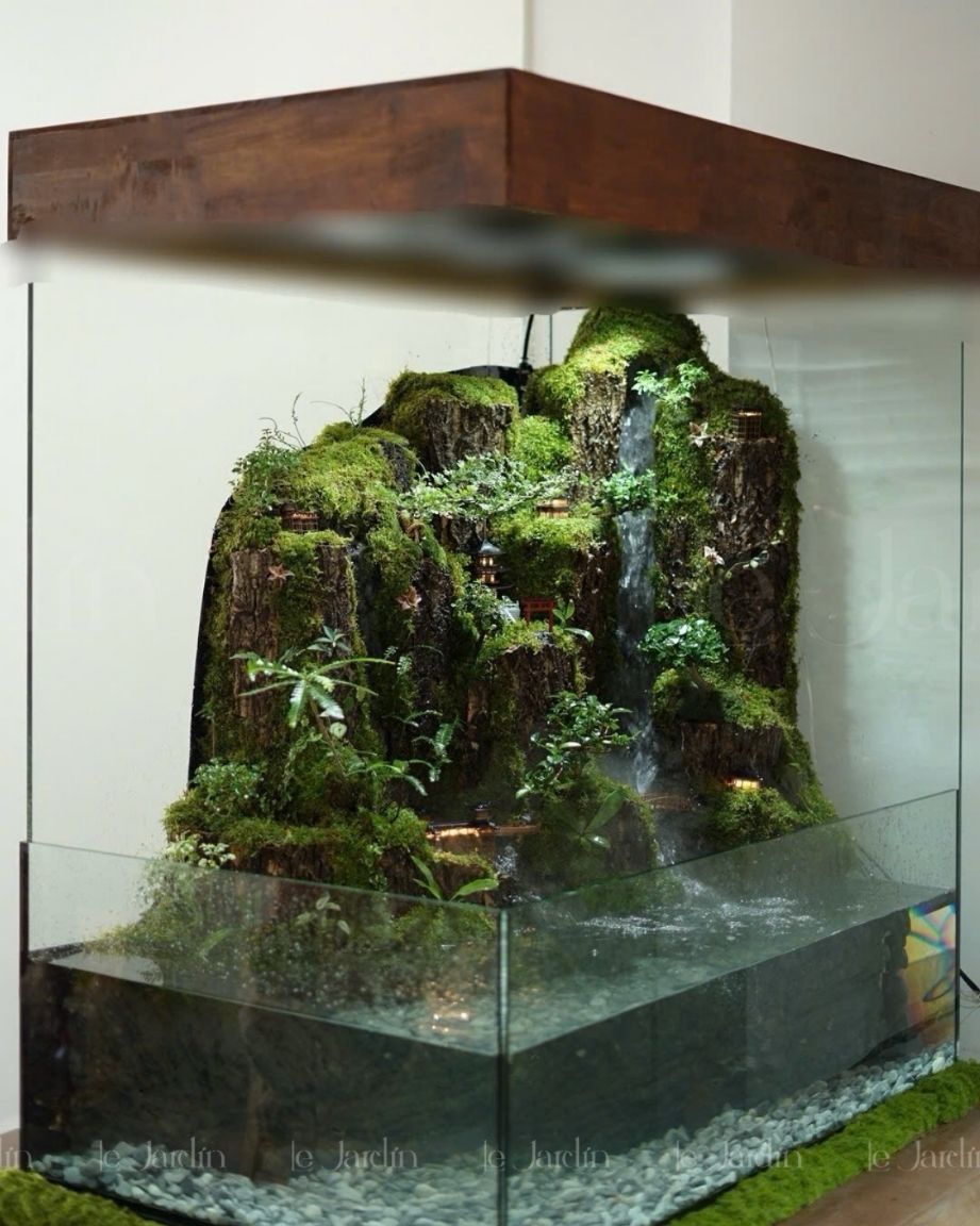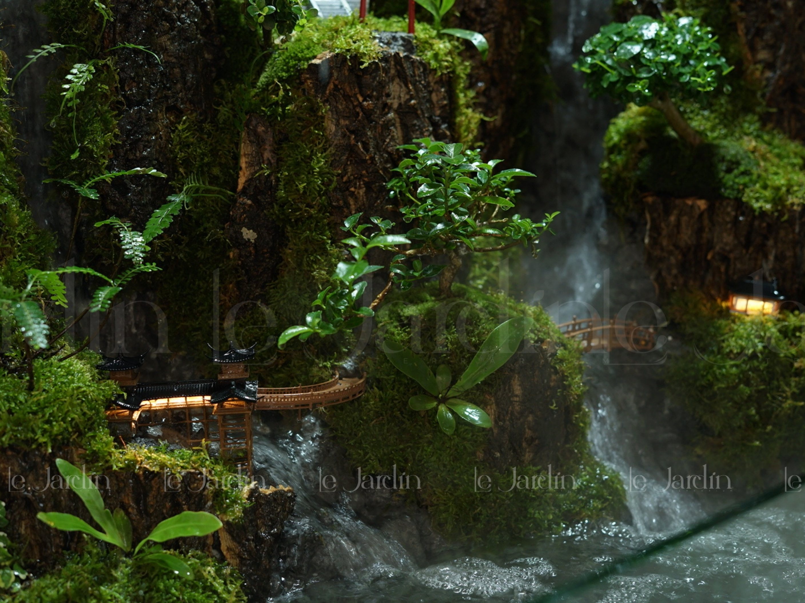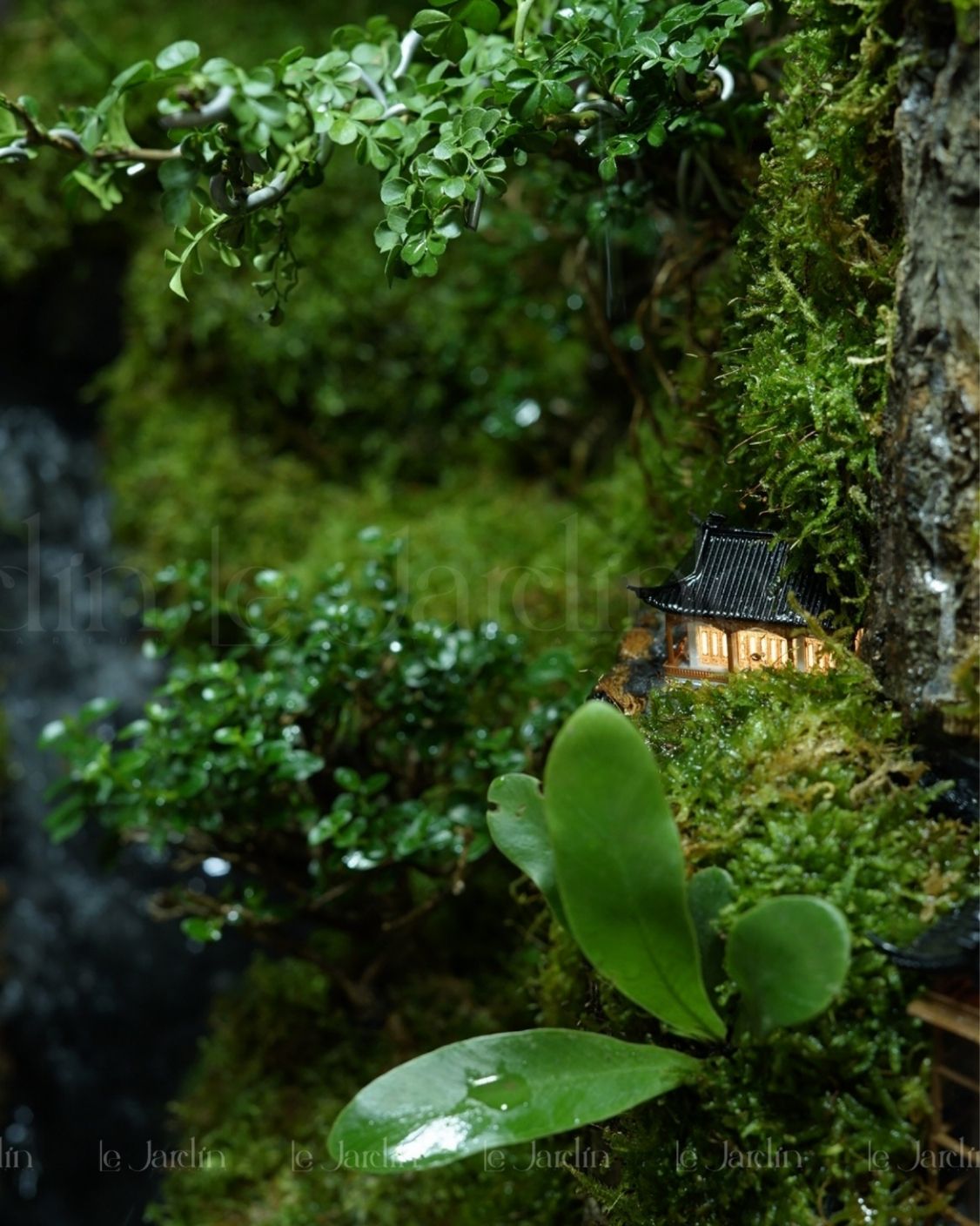 Sự kết hợp hài hòa giữa rêu phong organic, đường vân gỗ tự nhiên và chi tiết tượng nghệ thuật tạo nên một bố cục thư thái, gợi cảm giác như đang đứng giữa một góc rừng thu nhỏ.