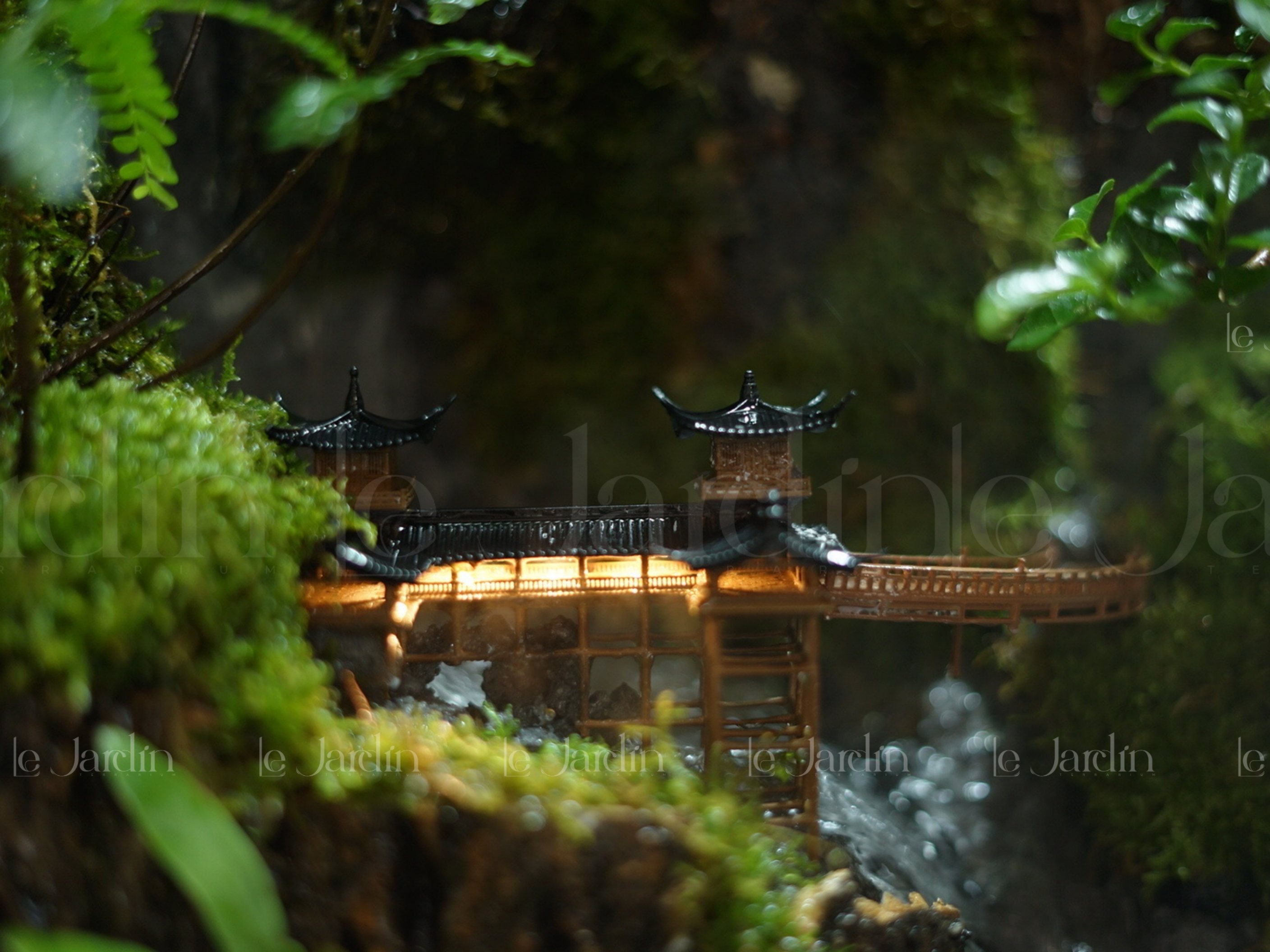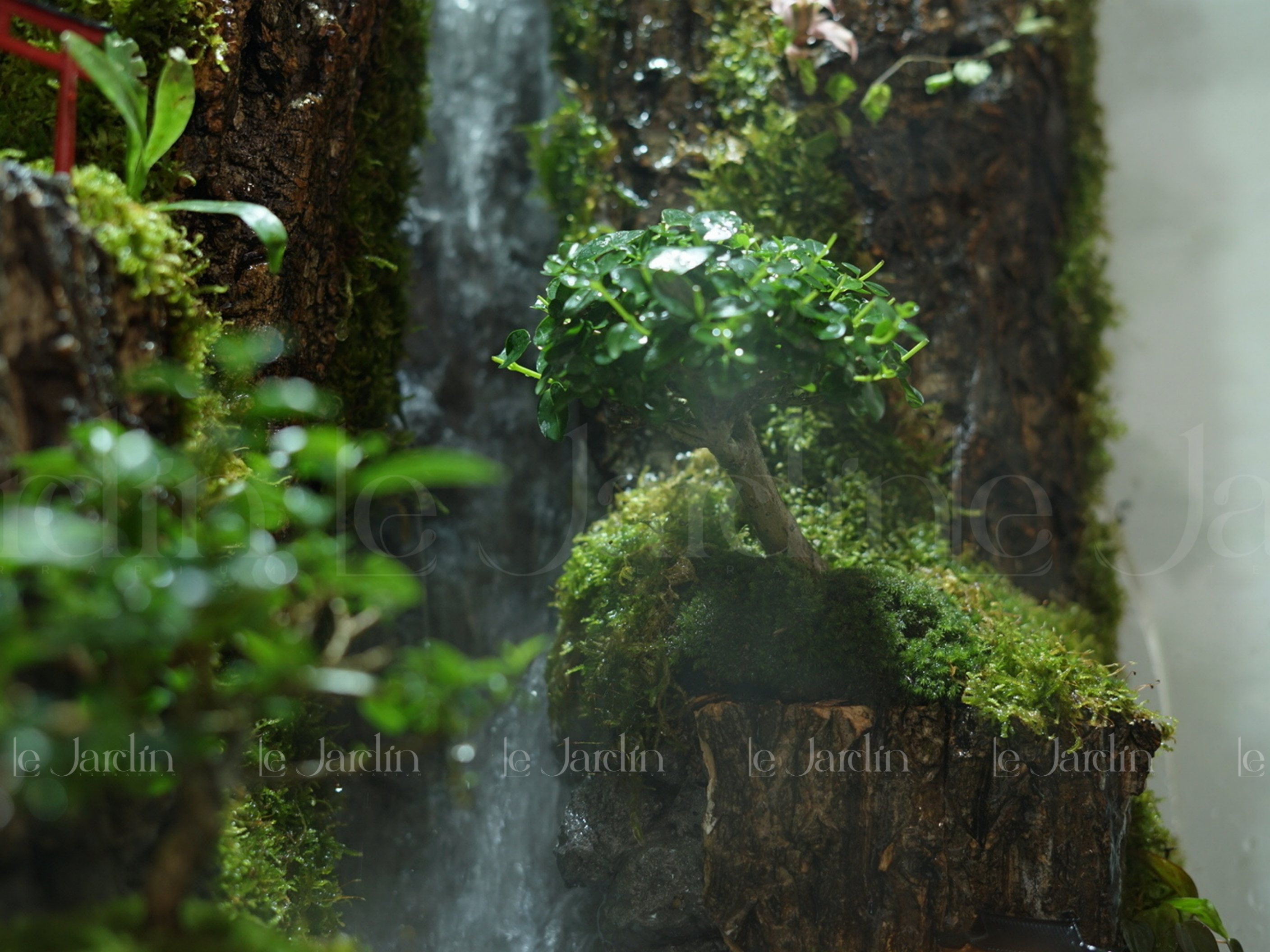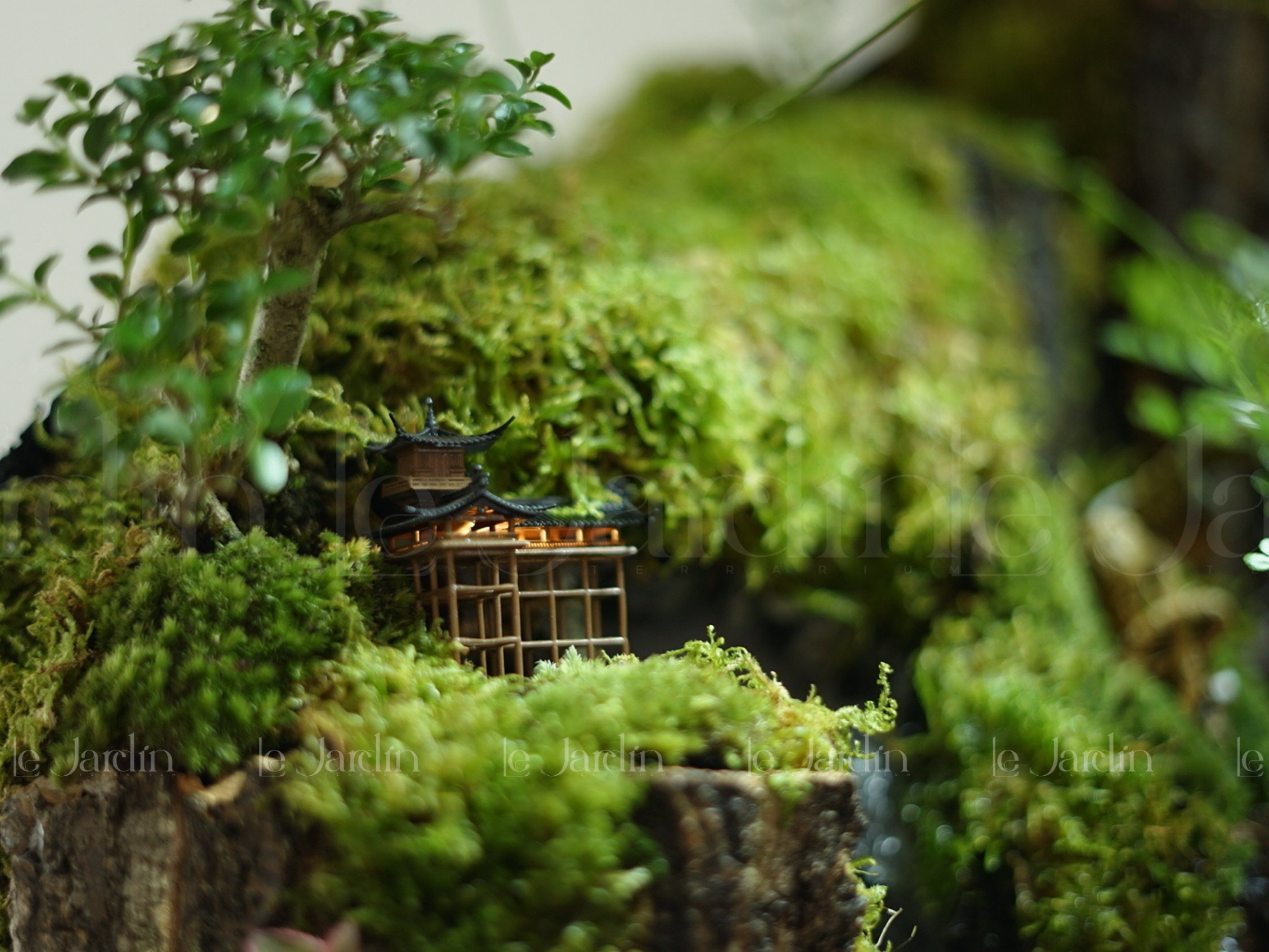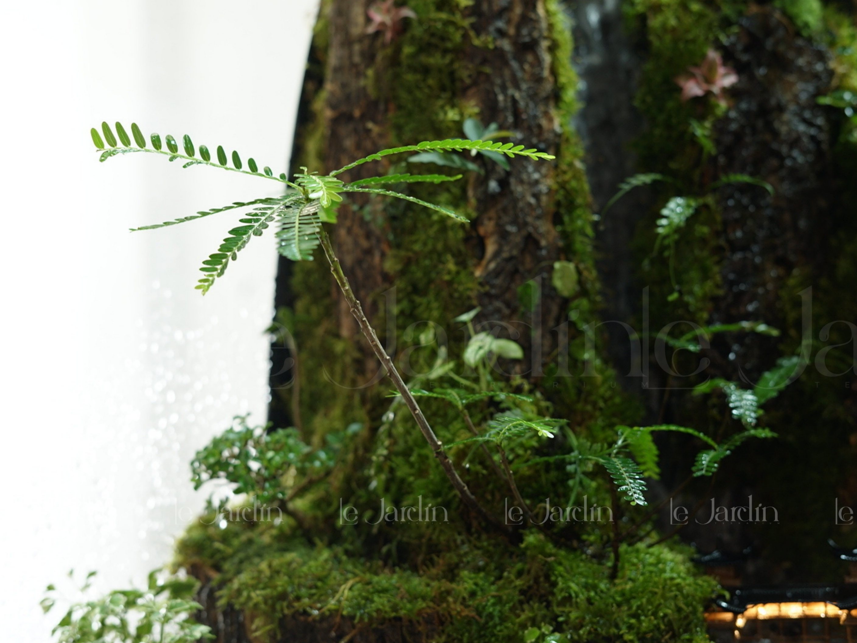 Sự kết hợp hài hòa giữa rêu phong organic, đường vân gỗ tự nhiên và chi tiết tượng nghệ thuật tạo nên một bố cục thư thái, gợi cảm giác như đang đứng giữa một góc rừng thu nhỏ.