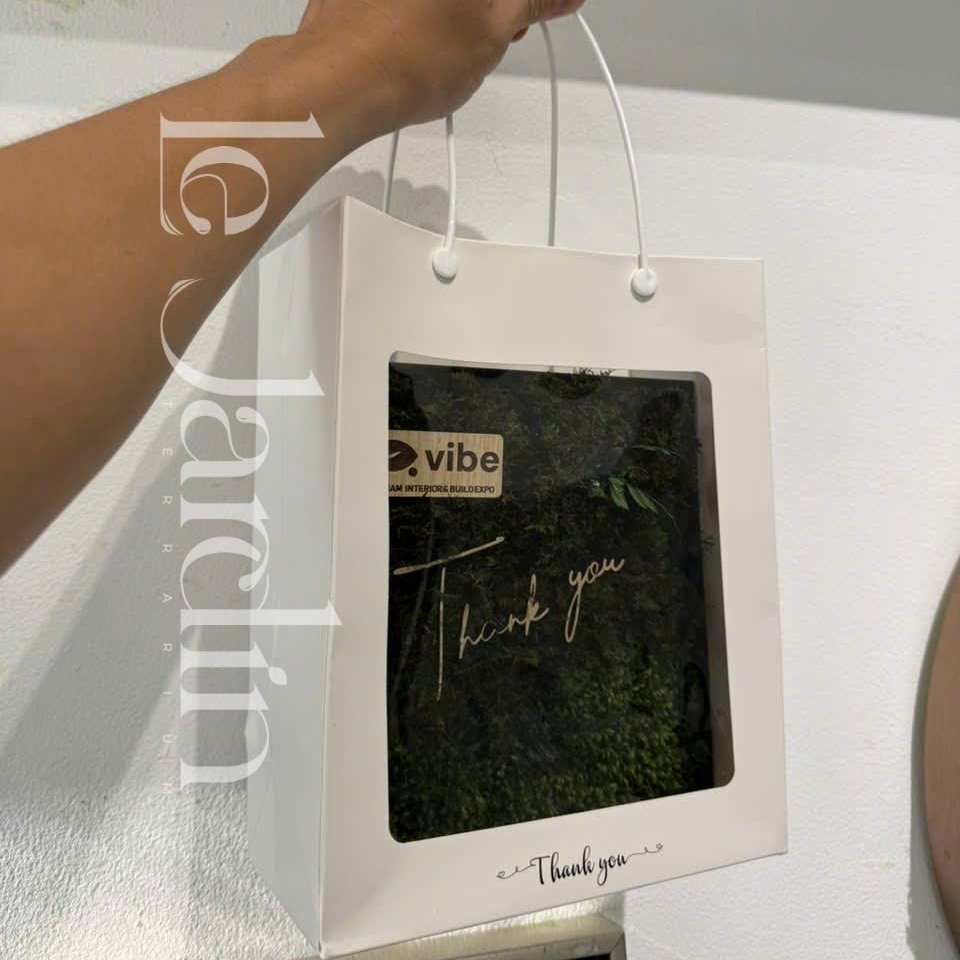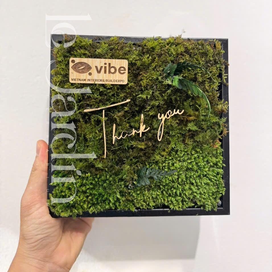 Thiết kế: Layout Mặt rêu được phối lớp hài hòa, gồm rêu bảo tồn nhiều kết cấu, tạo cảm giác mềm mại và chiều sâu tự nhiên. Điểm nhấn tinh tế nằm ở dòng chữ “Thank you” cắt laser và logo thương hiệu