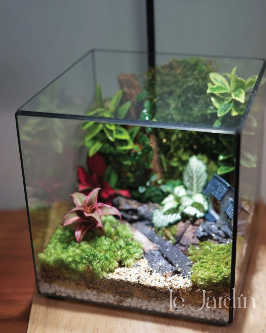 Thực vật: 4-10 loại rêu hiếm tuỳ vào vụ mùa, Dương xỉ Davalia hoặc Dương xỉ lá me, dây leo mini, có thể mix thêm cây màu sắc khác tuỳ ý.