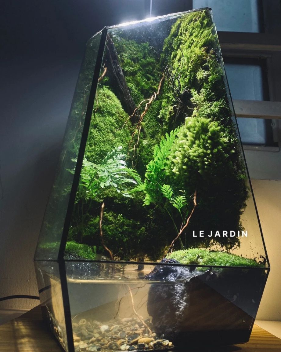 Thực vật: 4-10 loại rêu hiếm tuỳ vào vụ mùa, Dương xỉ Davalia hoặc Dương xỉ lá me, dây leo mini, có thể mix thêm cây màu sắc khác tuỳ ý.