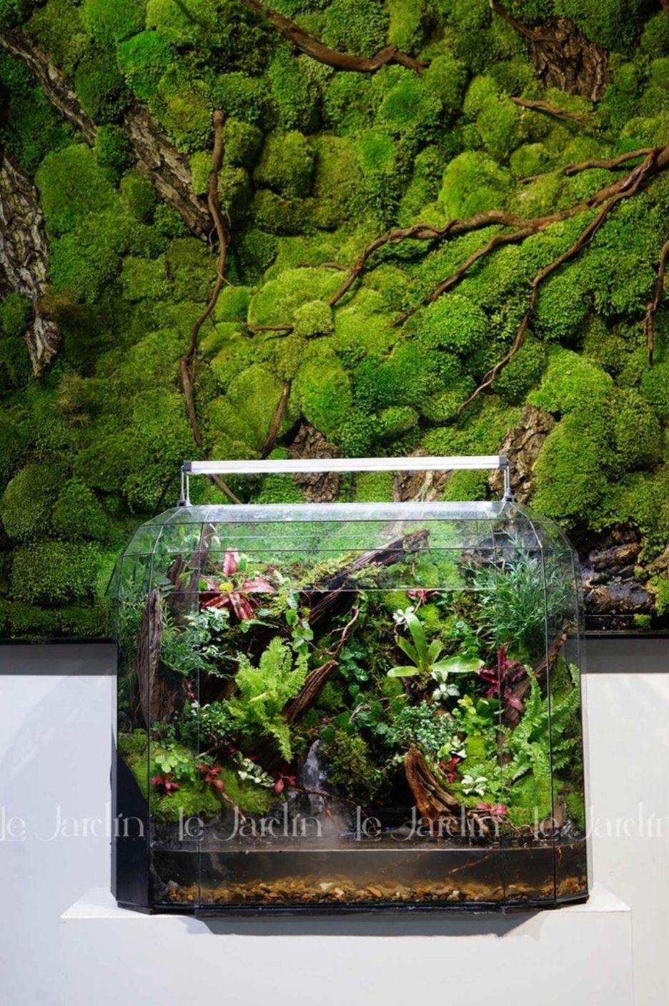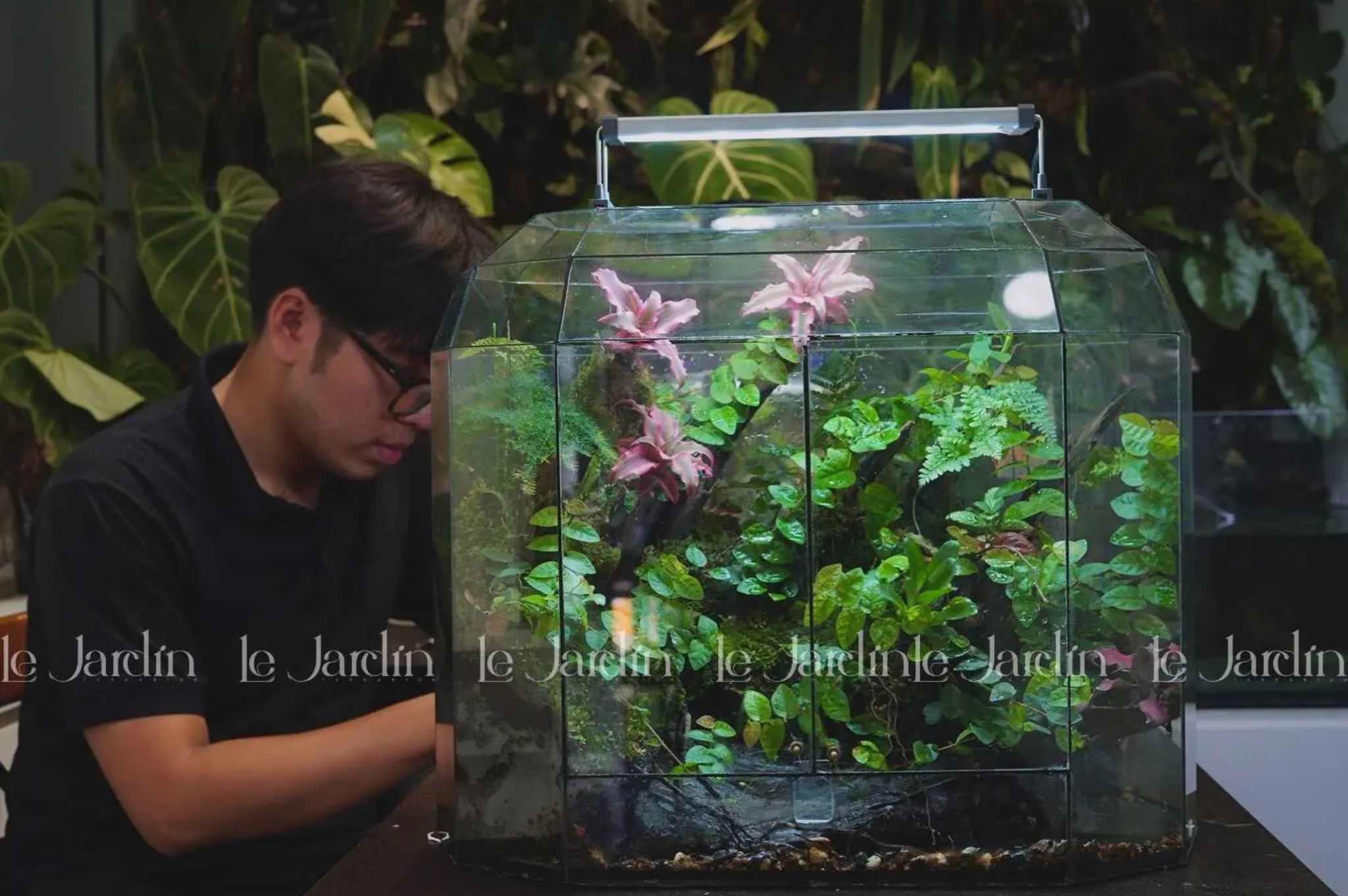 Thực vật: 4-10 loại rêu hiếm tuỳ vào vụ mùa, Dương xỉ Davalia hoặc Dương xỉ lá me, dây leo mini, có thể mix thêm cây màu sắc khác tuỳ ý.