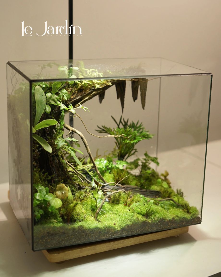 Thực vật: 4-10 loại rêu hiếm tuỳ vào vụ mùa, Dương xỉ Davalia hoặc Dương xỉ lá me, dây leo mini, có thể mix thêm cây màu sắc khác tuỳ ý.