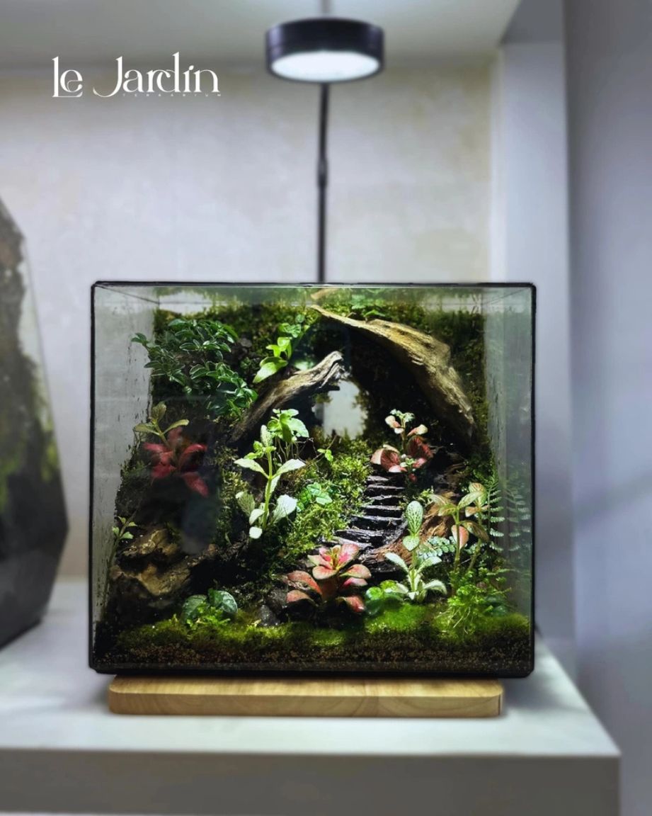 Thực vật: 4-10 loại rêu hiếm tuỳ vào vụ mùa, Dương xỉ Davalia hoặc Dương xỉ lá me, dây leo mini, có thể mix thêm cây màu sắc khác tuỳ ý.
