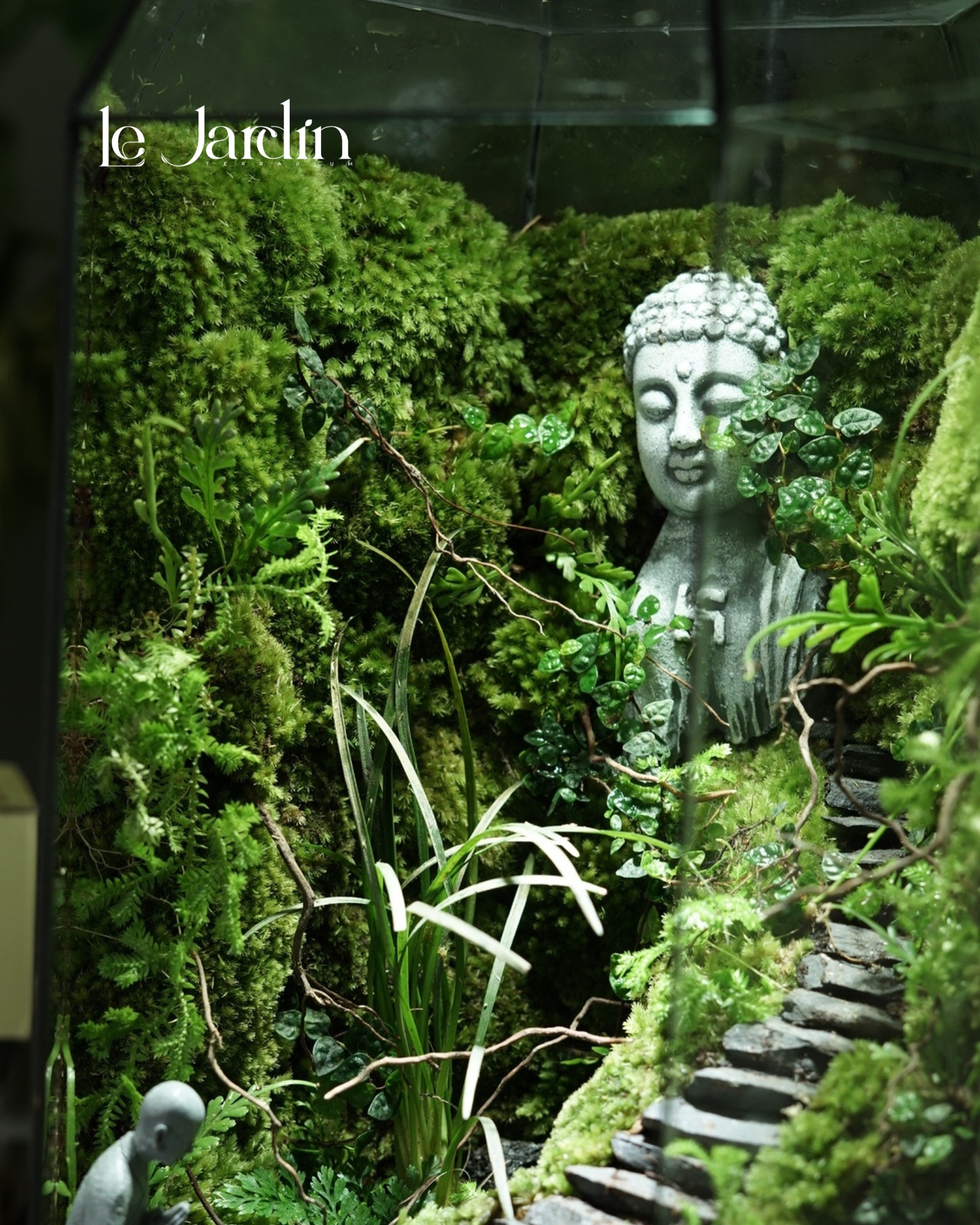 Thực vật: 4-10 loại rêu hiếm tuỳ vào vụ mùa, Dương xỉ Davalia hoặc Dương xỉ lá me, dây leo mini, có thể mix thêm cây màu sắc khác tuỳ ý.