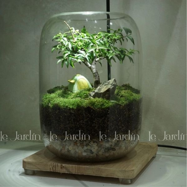 Thực vật: 4-10 loại rêu hiếm tuỳ vào vụ mùa, Dương xỉ Davalia hoặc Dương xỉ lá me, dây leo mini, có thể mix thêm cây màu sắc khác tuỳ ý.