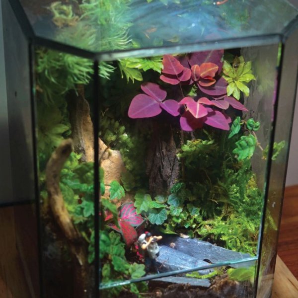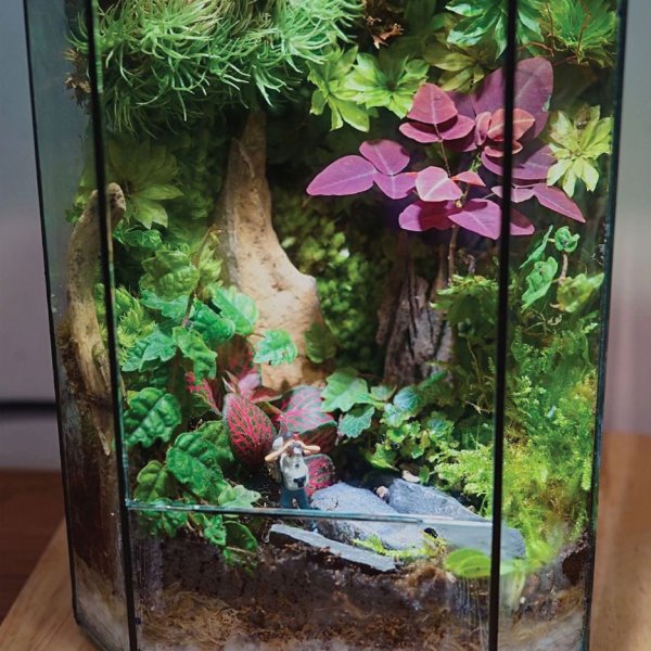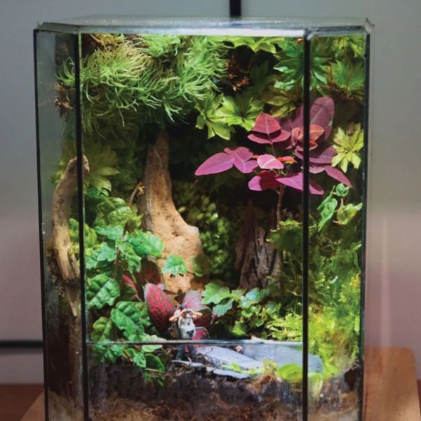 Thực vật: 4-10 loại rêu hiếm tuỳ vào vụ mùa, Dương xỉ Davalia hoặc Dương xỉ lá me, dây leo mini, có thể mix thêm cây màu sắc khác tuỳ ý.