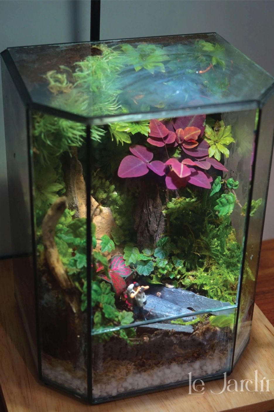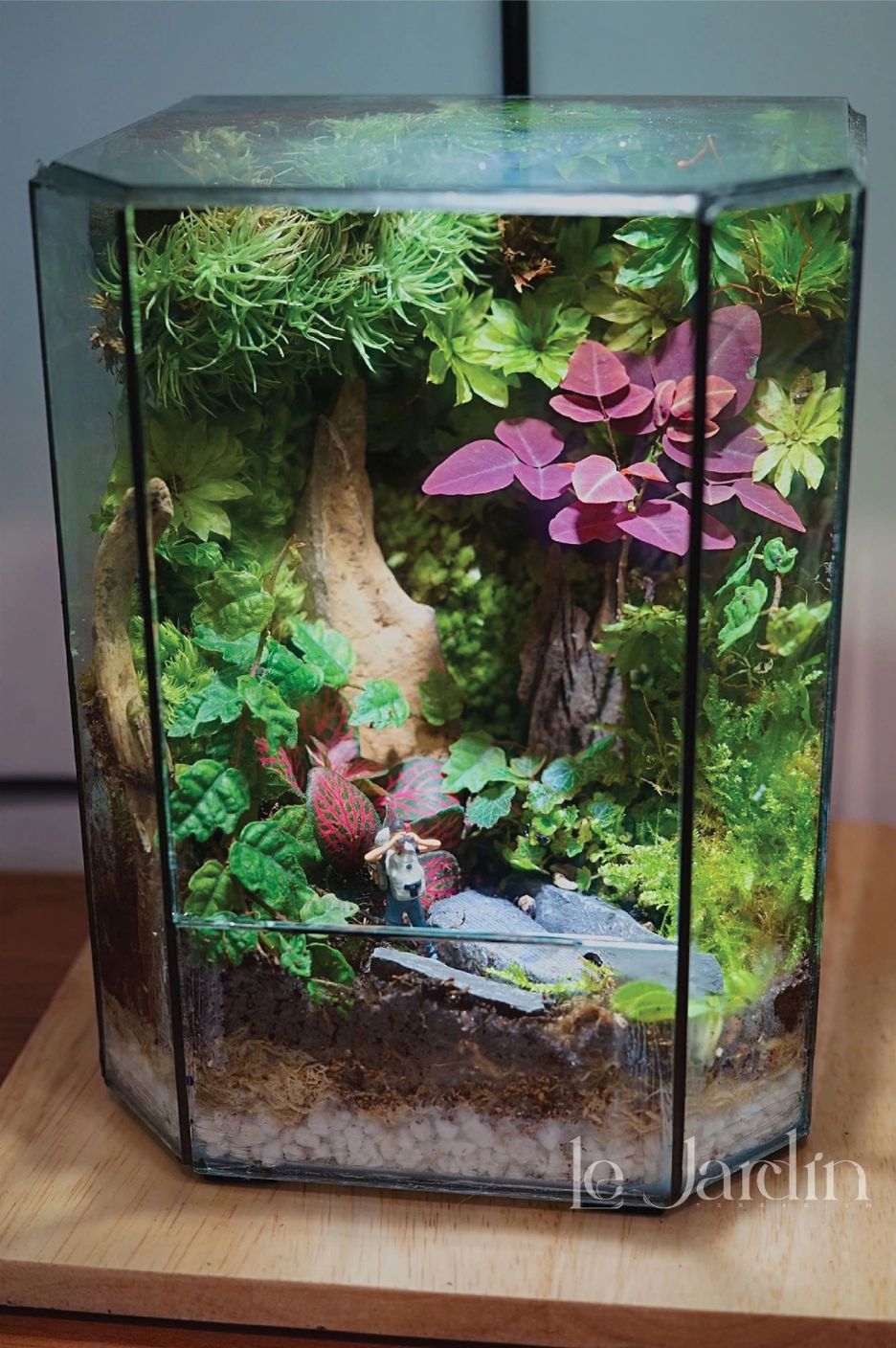 Thực vật: 4-10 loại rêu hiếm tuỳ vào vụ mùa, Dương xỉ Davalia hoặc Dương xỉ lá me, dây leo mini, có thể mix thêm cây màu sắc khác tuỳ ý.