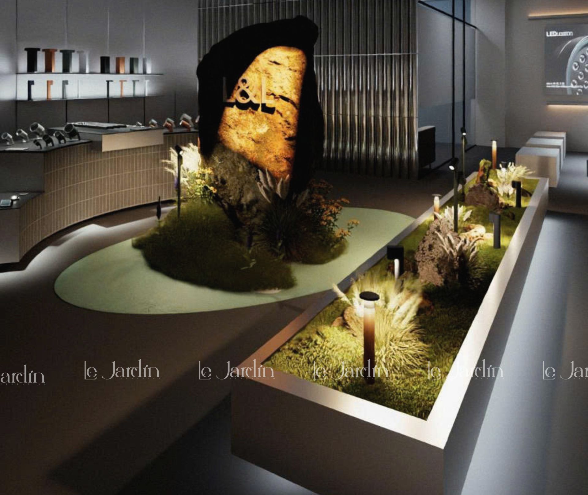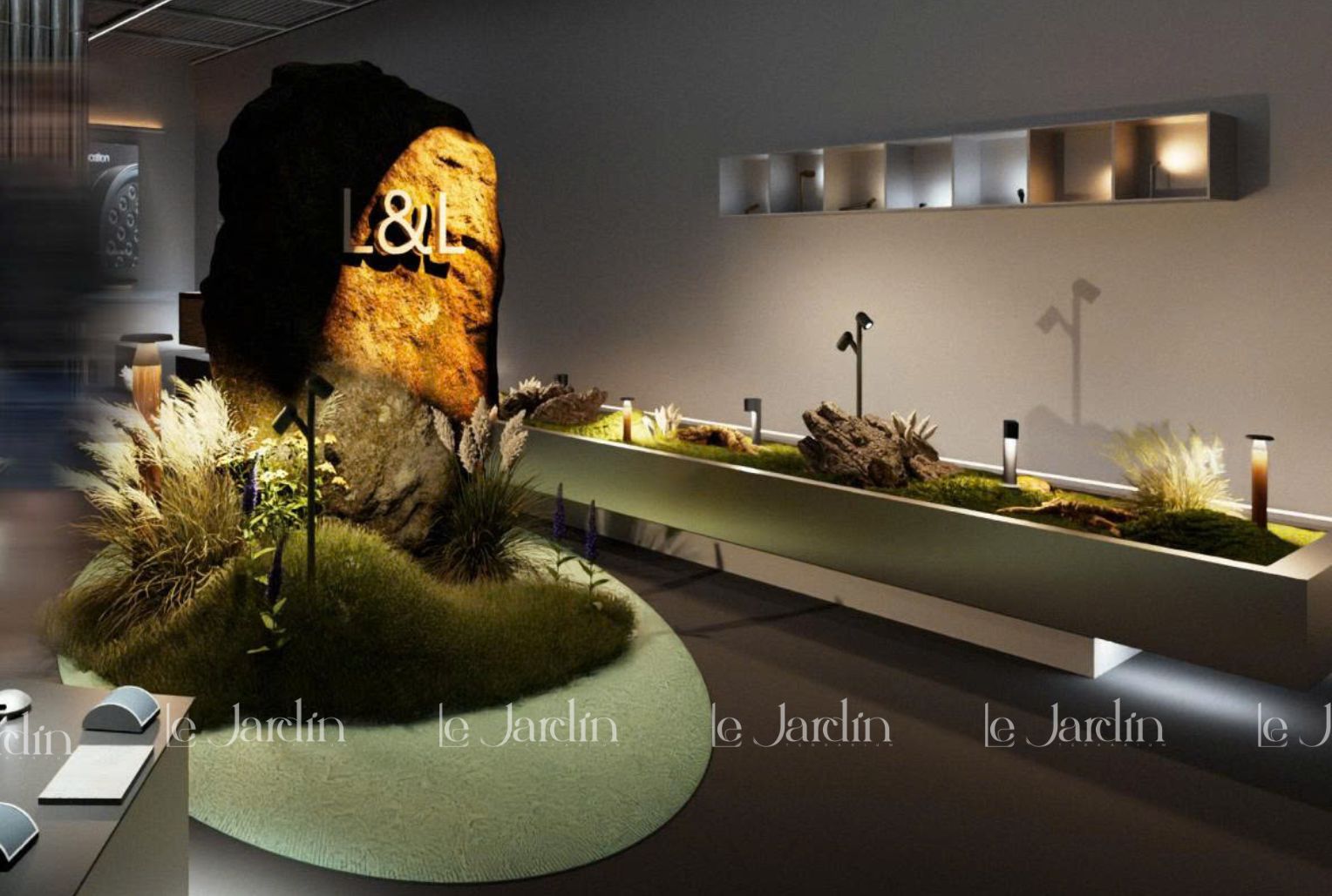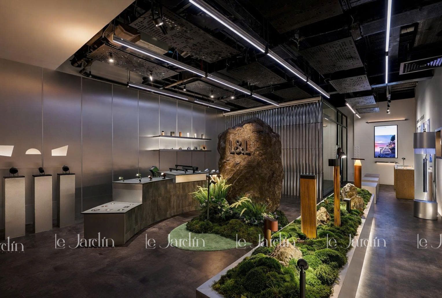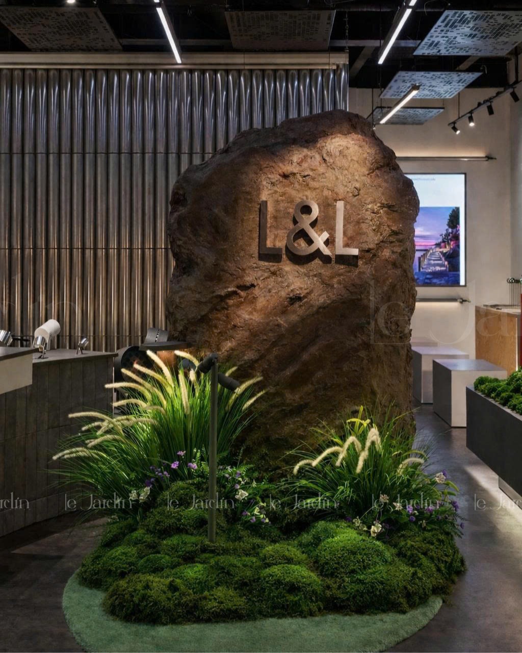 Đặc biệt, Lejardin đề xuất thêm một yếu tố khác biệt: Tiểu cảnh trung tâm với đá tự nhiên và mảng xanh, kết hợp ánh sáng để tạo một điểm dừng thị giác – vừa là điểm nhấn thương hiệu, vừa giúp cân bằng cảm xúc trong không gian mang tính kỹ thuật cao.