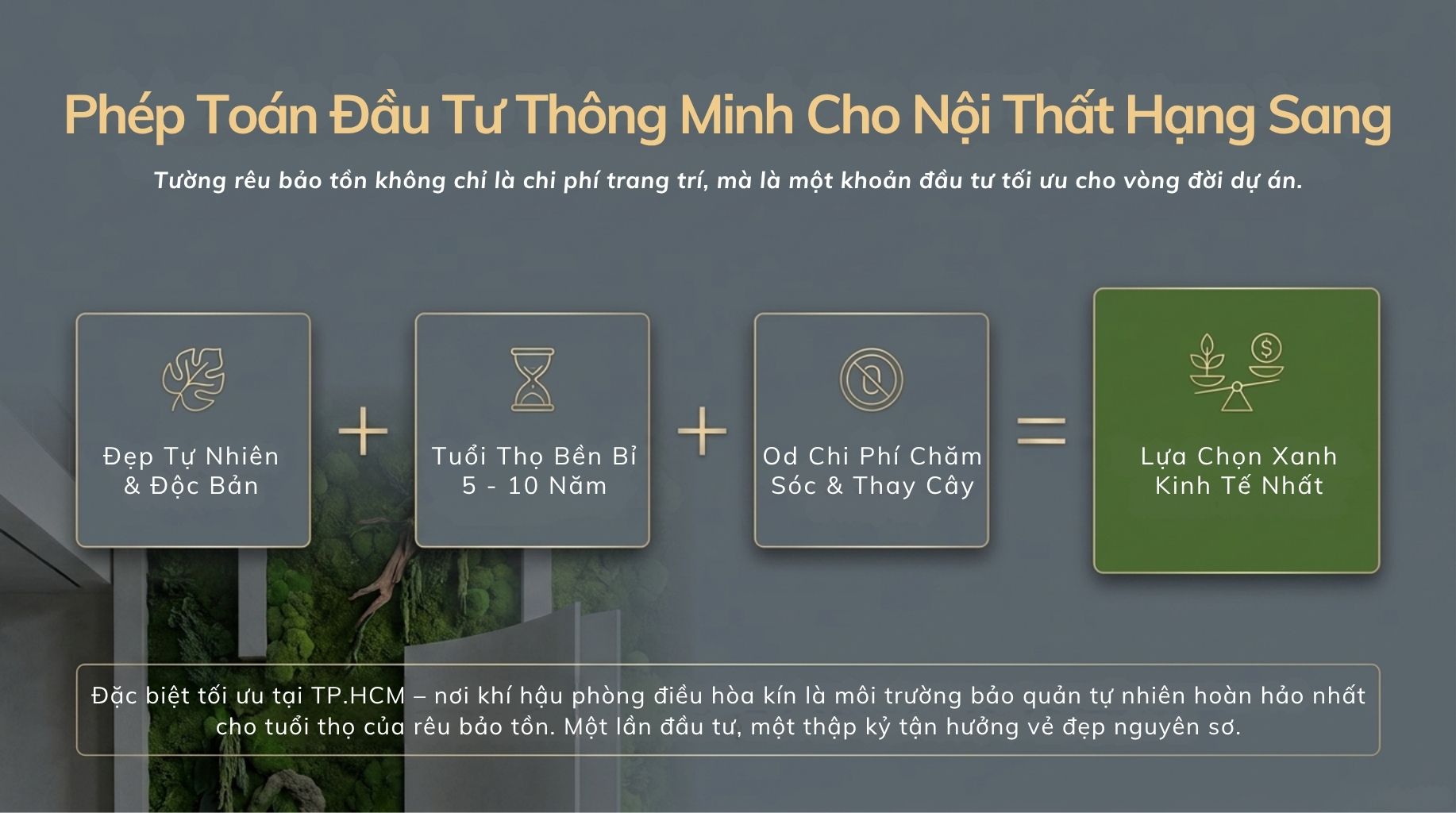 Thì tường rêu bảo tồn là lựa chọn rất đáng đầu tư cho không gian nội thất, đặc biệt tại TP.HCM – nơi khí hậu và môi trường rất phù hợp với loại vật liệu này.