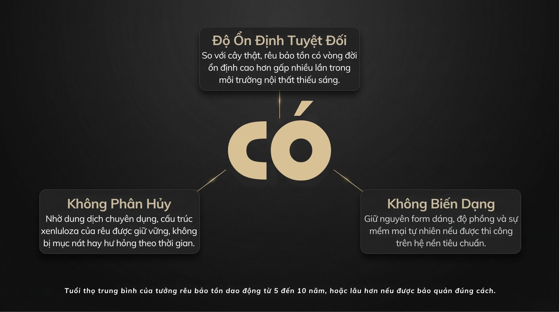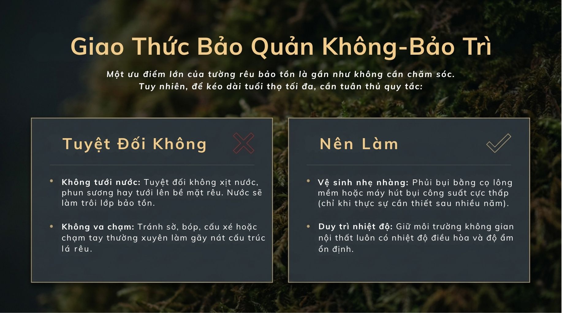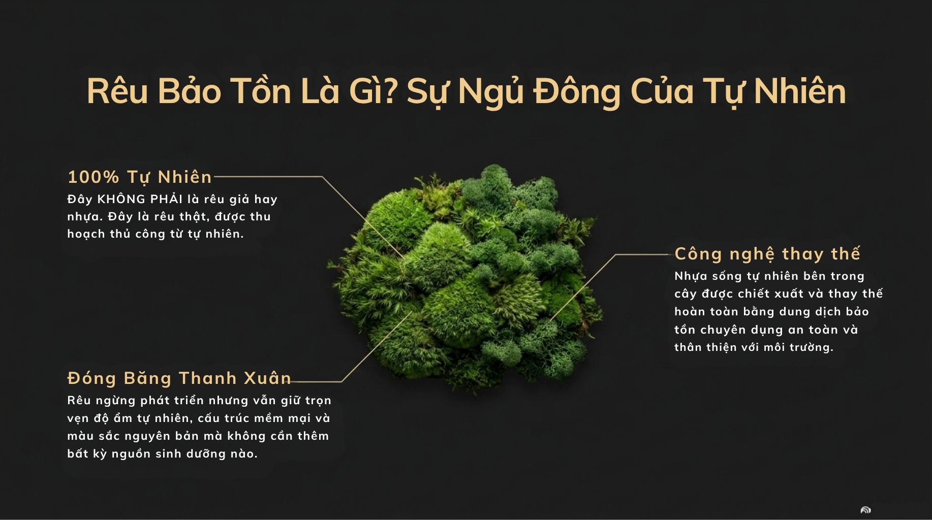 Rêu sau khi bảo tồn đã được thay thế nhựa sống bằng dung dịch chuyên dụng (glycerin-based), giúp: